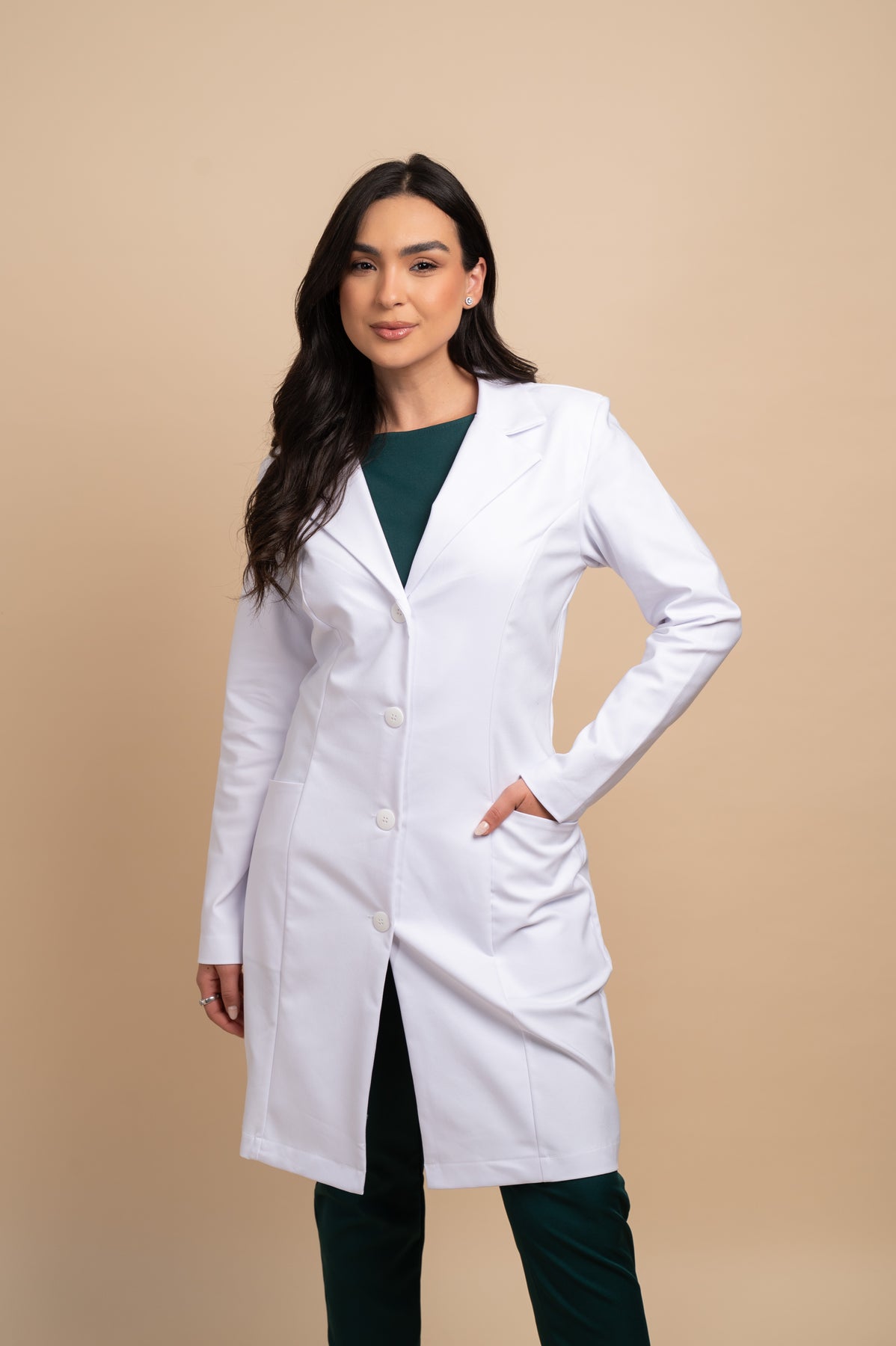 Jaleco Feminino acinturado com gola smoking, bolsos frontais e ombreiras discretas que valorizam a região do colo.