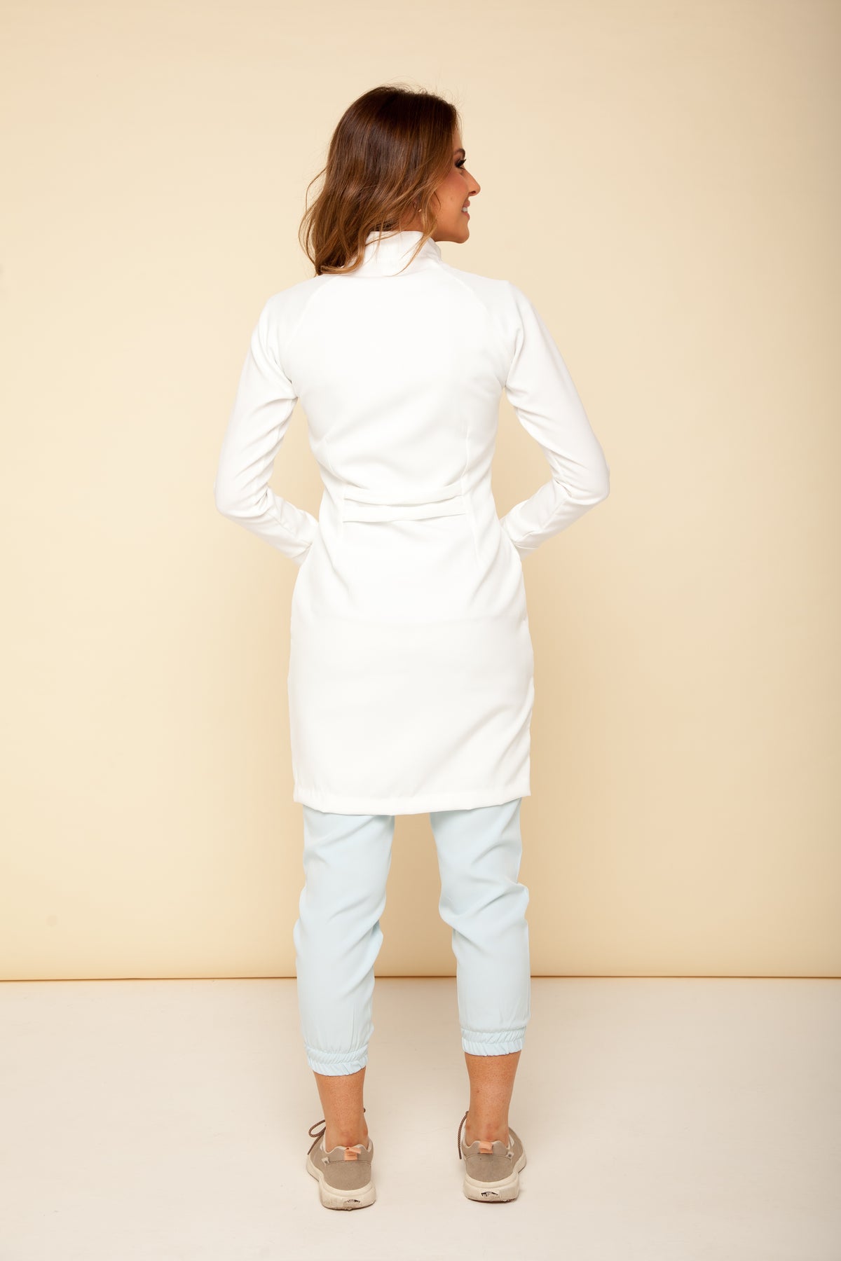 Jaleco feminino acinturado com gola padre, fechamento em ziper oculto e bolsos frontais.