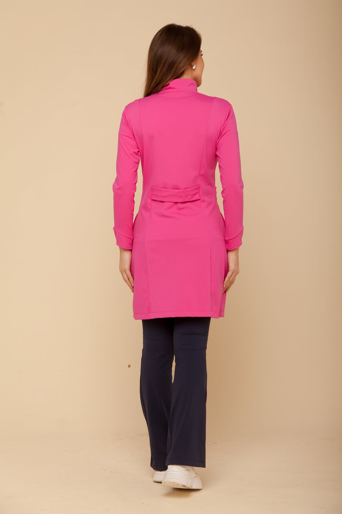 Possui elasticidade em quatro direções, alta respirabilidade, secagem rápida e proteção UV 50+, garantindo liberdade de movimento e sofisticação o dia todo.